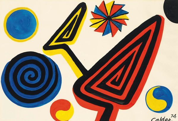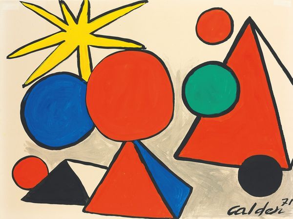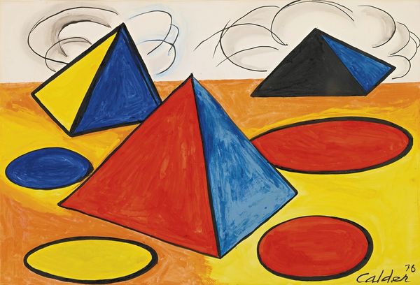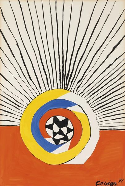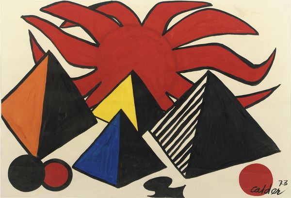 Editor: This is Alexander Calder’s "Pyramids and Sun on Target" from 1973, painted with acrylics. The shapes are so simple, almost childlike, but the strong colors make it surprisingly bold. How would you interpret this work? Curator: Calder's painting exists within a fascinating cultural moment. Pop Art was challenging established norms, blurring the lines between high and low culture, while geometric abstraction offered a kind of visual purity, and Calder navigates this territory beautifully. It’s interesting to consider how a geometric and simplistic style might suggest a commentary on, or even a simplification of, ancient and culturally loaded forms like pyramids, what do you think? Editor: That makes sense. The pyramids definitely feel less imposing here, almost playful. Curator: Exactly! It removes their weight. The bright, almost cartoonish sun, with its "target," brings forward the influence of pop-art that permeated society at that moment, in posters, political imagery, advertising, and more. Where do you think this painting would best “live”—in a gallery, or perhaps as the visual backdrop of a play or show? Editor: I think it could function well in either scenario because the clean design and strong colors work across many contexts. Curator: Precisely. Calder understood the evolving relationship between art and its audience, pushing for art to be something accessible and engaging in various cultural settings. Considering that context shifts our perspective. Editor: Absolutely! Now I see it less as just simple shapes and more as a clever commentary on how we interact with symbols in a media-saturated world. Curator: Exactly! Considering the context helps understand that there's much more here than meets the eye.