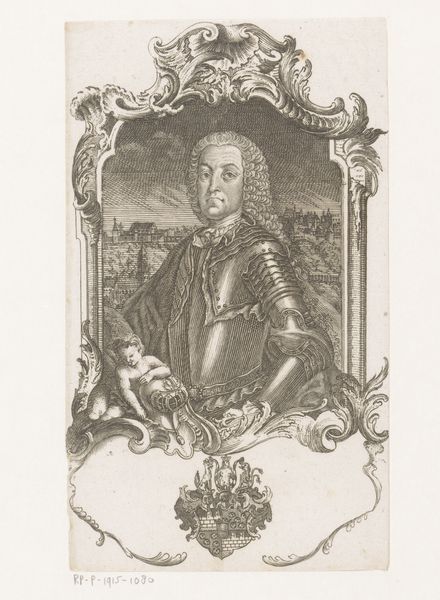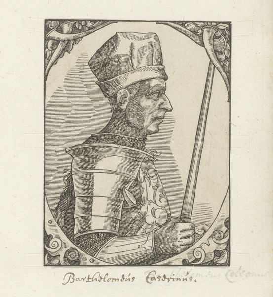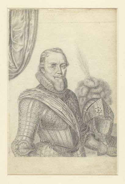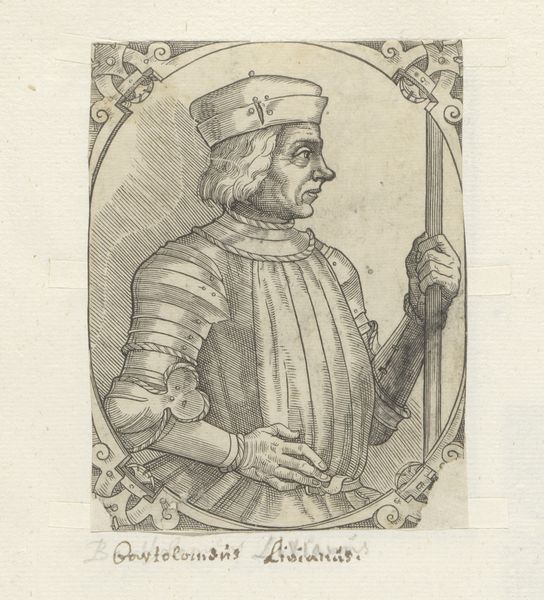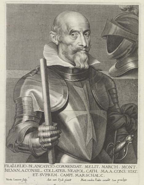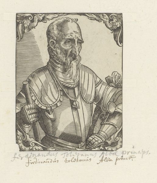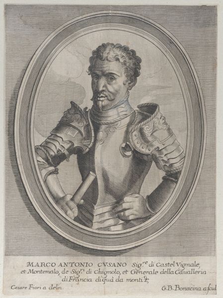 Curator: Looking at this rather severe portrait, it seems to be from sometime in the late Renaissance, portraying Niccolò di Pitigliano. This is an engraving; while we lack the artist’s identity, its origins can be placed roughly between 1549 and 1575. Editor: The lines feel so deliberate and controlled. Even with all that heavy armour, the texture seems light almost, achieved through what must have been painstaking labor. It's clearly not mass-produced, which makes me think about who would commission and consume such a thing. Curator: I see what you mean about lightness. Yet that intricate armour worn by di Pitigliano carries an important symbolic weight, it’s an embodiment of power and status in Renaissance society. Notice how the image subtly merges classical references within the more immediate details. Editor: True, and you can feel the social hierarchy embedded within the visual. This isn't just functional gear; the craft itself, the ornamentation, communicates wealth, skill, a whole economy of the decorative. The rendering is very deliberate—so controlled. How else did visual rhetoric enter play here? Curator: There is an unmistakable reference to military virtue here, so in line with Renaissance ideals of leadership. And you’ll observe, that on his armour, an oval design contains a depiction of the Madonna figure, bringing further emphasis on the man’s religious belief within this symbol-laden age. The overall tone and posture communicates both piety and resolve. Editor: It does prompt me to consider the social role fulfilled through art during that period: it's more than aesthetics; it's about the making of memory and meaning. An artisan creates a unique item through a labor intensive process with distinct intentions – it becomes an object charged with intent, carrying economic value within a defined socio-historical context. Curator: Precisely; the enduring power of this piece lies not just in its depiction of an individual, but in its evocation of an era. Thank you for reminding us about the context this work brings to light. Editor: And for me, this piece reminds us that artistry and craft carry economic meaning—labor transformed into narrative through carefully managed material.