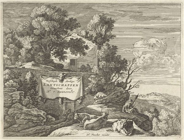 Allart van Everdingen created this etching titled ‘The Cottages at the Bank’ in the Netherlands sometime in the mid-17th century. It is a landscape dominated by rugged topography, dense forest, and two rustic buildings next to two figures. The Dutch Golden Age saw artists exploring secular themes, and landscape painting became a popular genre reflecting the nation's growing wealth and connection to the natural world. Everdingen's choice to depict a somewhat wild, almost Scandinavian scene is intriguing. It may reflect a growing interest in the exotic and untamed, contrasting with the highly cultivated Dutch landscape. The cottages suggest a human presence, perhaps a commentary on the relationship between humanity and nature. Is it harmonious, or is man attempting to tame the wilderness? To delve deeper, it would be fascinating to research Dutch trade routes of the time and the cultural perceptions of foreign lands. Through such research, we can understand the significance of landscape as a projection of cultural values.