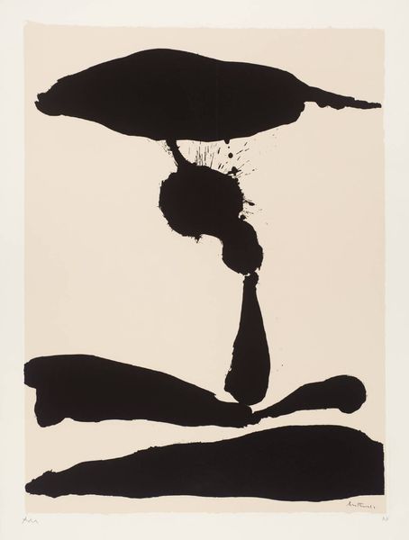Curator: Victor Pasmore, born in 1908, was deeply interested in abstraction, and this example from the Tate collection is called "Transformation 5". It presents bold, curving black forms against a white background. Editor: It's so immediate. It feels weighty, almost like dark clouds about to burst. Is it a print? The stark contrast is really striking, yet those rounded shapes soften the overall effect. Curator: Yes, the interplay between the heavy black and bare white creates that tension. Pasmore was fascinated with the possibilities of pure form and its emotional impact, something he explored across different media. These shapes aren't meant to represent anything in particular, but perhaps evoke a feeling or sensation. Editor: I find it playful, too. The title suggests movement, change. It's as if these shapes are dancing, constantly morphing into something new before our eyes. Curator: Absolutely, and thinking of Pasmore's wider career, he often drew inspiration from the natural world, translating those observations into abstract compositions. He saw abstraction as a way to capture the essence of things, rather than a literal representation. Editor: It reminds me that transformation isn't always pretty or neat; it can be messy, bold, and even a little bit unsettling. Thanks for letting me see it in a new way.