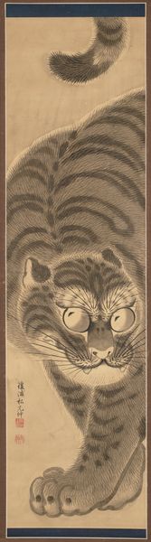 Curator: Let's explore Piroska Szanto's drawing, titled simply, "Cat." Rendered in pencil and graphite, it presents a unique take on feline representation. Editor: It's oddly regal, isn't it? Like a cat-pharaoh in minimalist garb. And that tongue sticking out just slightly kills me! A master of passive-aggressive judgment, if I ever saw one. Curator: Indeed. Notice the interplay between the positive and negative space created by the dark background and the white and pink lines? It’s an economical drawing, focusing on essential form. The artist uses geometric shapes, such as the vertical lines that suggest its chest or the circles making up much of its body, to render the cat in a very stylized manner. Editor: Stylized for sure. There's a wonderful sense of both vulnerability and irony there, almost as though the cat is mocking the idea of 'catness'. That elongated neck almost makes it seem surprised to exist! Curator: The symmetry is certainly notable, isn't it? Though the head has subtle asymmetry. This controlled contrast is an artistic device that animates the image while maintaining the compositional rigor of a portrait. And look how flat it is! It almost defies depth and challenges the viewer's spatial perceptions. Editor: You know, its gaze almost pulls you in. But I can’t help imagining this feline bursting into existential monologues between naps. Its eyes express world-weariness that mirrors our own chaotic inner realms. Perhaps it represents how the world sees us right now, an outsider peering back. Curator: It is striking how the artist merges representational and abstract modes to explore our fascination with cats. Its presence prompts one to meditate on the human/animal dichotomy within our perception. Editor: In the end, I just appreciate that cheeky tongue! Art is meant to elicit emotional connections and reactions and Szanto nails it by embracing humor, however understated it may be. Curator: Indeed. This concise feline form prompts the contemplation of formal choices and the intersection of the familiar and uncanny.