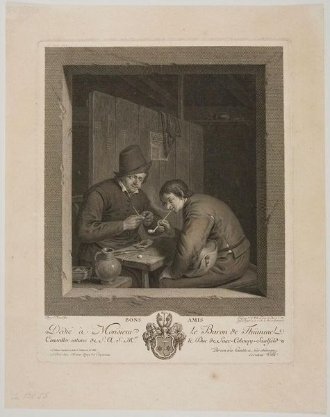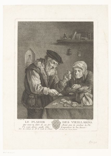 Editor: This is "Old Men's Enjoyment" by Jacques Firmin Beauvarlet. It's an etching, and the scene feels so intimate, like a captured moment. What do you see in this piece, beyond just old men enjoying… something? Curator: It tickles my funny bone, honestly. Look at their faces, all scrunched up in concentration over their little pile of coins. It's about more than just money, isn't it? It’s about control, security, maybe even a bit of rebellion in their twilight years. Ever feel like you're hoarding moments, not money? Editor: That's a really interesting take! I was so focused on the age aspect, but the idea of rebellion… I hadn't considered that. Curator: Exactly! It's a reminder that joy, in any form, is precious, especially as time marches on. Beauvarlet's captured a quiet revolution here.