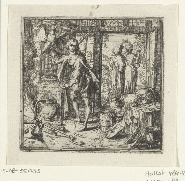 Romeyn de Hooghe created this illustration for Boccaccio's Decameron, capturing a scene of intimate interaction. De Hooghe was active during the Dutch Golden Age, a period marked by significant economic prosperity and cultural flourishing in the Netherlands. The artwork subtly navigates the complexities of gender and social status. The woman's elaborate dress and feathered fan suggest a position of privilege, yet her posture and expression hint at a deeper, perhaps stifled, emotional life. The man’s gesture and gaze direct our attention, yet the narrative remains ambiguous. This piece invites us to consider the unspoken dialogues within social interactions. It speaks to the ways in which individuals negotiate identity and desire within the confines of societal expectations. The illustration offers a glimpse into a world where appearances and realities may often diverge.