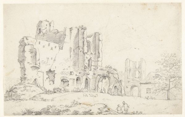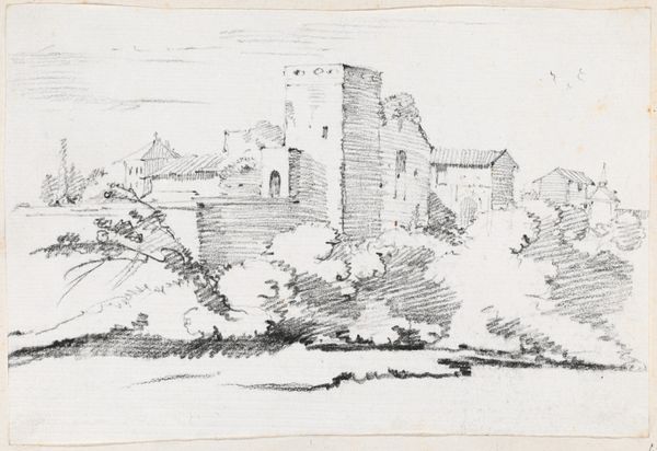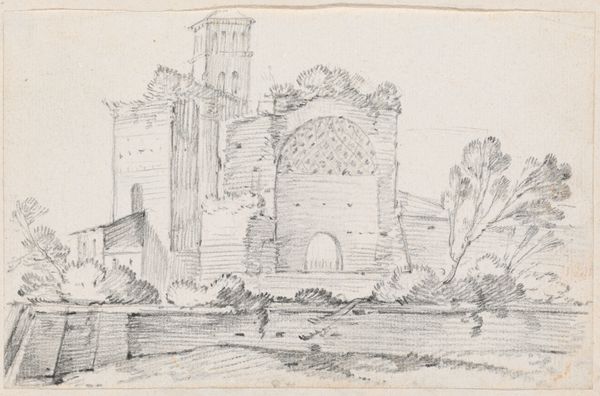 Curator: Philippe Jacques de Loutherbourg offers us "View of an Old Castle on the Rhone" in this drawing currently held at the Städel Museum. Editor: It has a very delicate and almost ethereal quality, wouldn’t you agree? The light pencil strokes give it a hazy, dreamlike feel, and the sheer scale seems diminished by the limited palette. Curator: The romantic spirit certainly pervades. Consider how castles represent power, history, and cultural continuity—these structures embed symbolic narratives. Here, we observe one partially in ruins, yet it remains majestic and stoic against time. This contrast echoes the sublime. Editor: I agree. The architectural rendering itself, even in pencil, adheres to strict geometrical forms and creates a compelling interplay of light and shadow—classicism’s embrace of structure is quite clear. There's something inherently ordered within the decaying form. Curator: Exactly, observe the small figures by the water—a symbol for the passage of time, a silent acknowledgement of change. They could represent pilgrims visiting a holy site, given the scale of what appears to be a cathedral. The location beside the river underscores transit—linking people and places through culture and faith. Editor: Yes, and consider how Loutherbourg deploys line and form; each architectural element possesses both mass and delicacy. The textured surfaces of the castle juxtapose beautifully with the smooth water and sky. Note that even within this restricted chromatic spectrum, there are countless tonal modulations creating atmospheric perspective. Curator: I’m especially drawn to how the castle and surrounding architecture appear simultaneously timeless and temporal. These crumbling stones bear witness to epochs; empires have risen and fallen around them, making it resonate deeply on an emotional level. Editor: Absolutely. Looking at it now, it really comes across as less a depiction of decay and more an homage to structure—or maybe it is a structural depiction of decay. In any case, quite well done, I'd say. Curator: It's a meditation, then, on both the tangible and intangible aspects of heritage. Editor: Well articulated, and I am certain that, after our discussion, listeners will be thinking about these themes themselves.