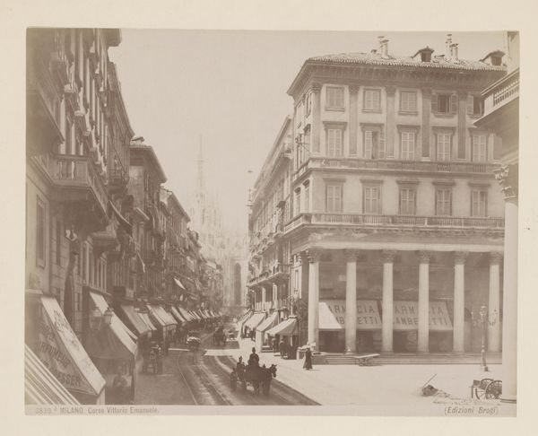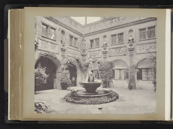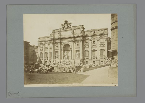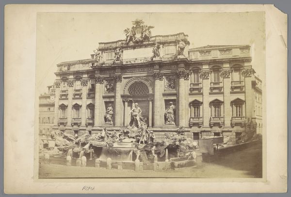 Curator: What a classically beautiful vista! Editor: Agreed. It almost feels too perfect, like a staged movie set instead of an organic cityscape. Curator: We're looking at a photograph, "Trevifontein te Rome," putting us sometime between 1851 and 1900, capturing the Trevi Fountain. Notice the gelatin-silver print used in the photographic process. The choice of materials in photographic prints like this reflects both aesthetic and practical considerations during the period. Editor: I'm struck by the composition—the stark geometry of the building juxtaposed with the wild, baroque exuberance of the fountain. And that blurred effect of the water, suggesting constant motion frozen in time, thanks to photographic materials available back then. The contrasts emphasize a certain dynamic tension, right? Curator: Certainly. It also reflects the era’s views of labor: Consider how this contrasts human-made static architecture against freely flowing elements. How are laborers engaged to maintain such a grand fountain versus laborers living in cramped apartments next door, or further beyond the camera’s perspective. It all seems tied to specific societal roles and expectations of beauty and luxury. Editor: I do like how the photographer framed it though! The shadows give such depth, pulling you into the scene despite the rather limited tonal range characteristic of older prints. Those statues on the fountain— Neptune perhaps?—almost seem to come alive with drama. Curator: I am much more keen about whether the workers in this region were granted artistic license as it pertains to water use, or where such fountains and public gathering places truly designed with public benefit as it claims. The narrative it builds in our collective imaginaries says as much. Editor: Interesting angle! But I feel it is in that tension of historical record against a created reality of luxury and design in plain sight. The picture asks as much of you. Thank you, Curator, for sharing the materiality-bound social context that informs its historical era and its complex meanings. Curator: And thank you for drawing us closer to understand its place within our culture.