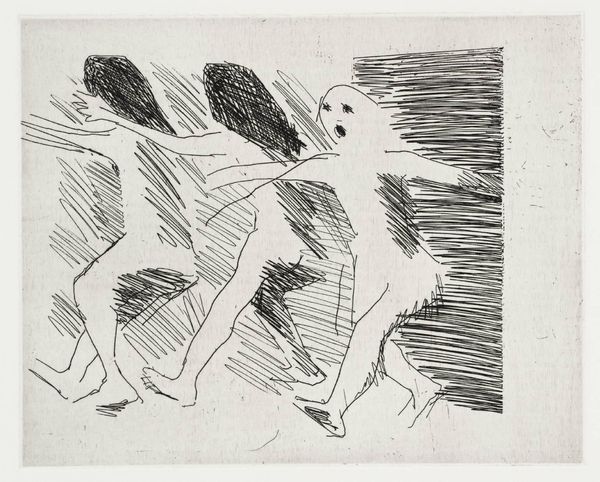 Editor: This print, "Untitled (Negritas Pasendo)" by Emilio Sanchez, depicts a group of women in simple dresses. There's an almost dreamlike quality to the scene, with the figures flattened and the colors muted. What strikes you about this piece? Curator: The title itself, translating to "Little Black Women Walking," raises questions about representation and the artist's perspective. How does Sánchez, as a Cuban artist working in the US, engage with ideas of race and identity in a way that fits within the social narratives of the time? Editor: That's a great point; I hadn’t thought about the title in that context. I was more focused on the aesthetic. Curator: The simplification of form and the limited color palette also speak to broader trends in printmaking and abstraction during the mid-20th century, navigating the public sphere of art and its political context. Editor: I see. So, it's not just a pretty picture, but a reflection of complex social and artistic currents. Curator: Precisely. It encourages us to consider the artist's role in shaping perceptions and engaging with the politics of imagery.
