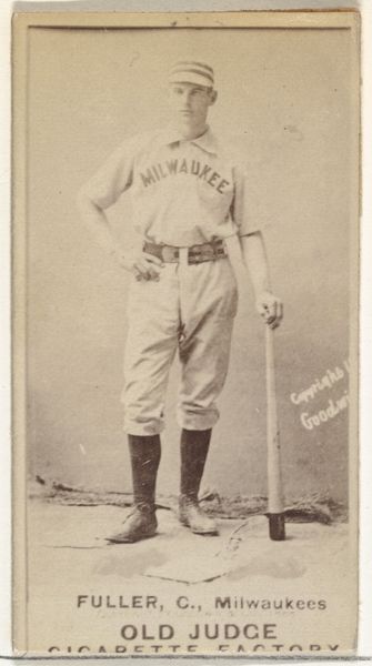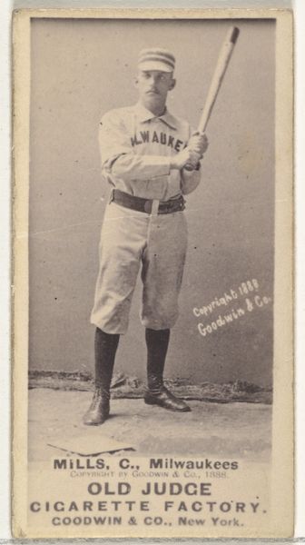 Curator: This is "William Shenkel, Pitcher, Milwaukee" from the Old Judge series of baseball cards, dating to 1888. It’s an albumen print, a popular photographic process at the time, produced by Goodwin & Company as a promotional item for Old Judge Cigarettes. Editor: It has a ghostly aura. The player's image is sharp, almost haunting, but everything behind him fades. You can feel the distance, and time. It makes me think about ephemerality of fame. Curator: Albumen prints involved coating paper with egg white, which created a smooth surface to hold photographic chemicals. They were a mass-produced commodity, meant to be collected and traded, a material manifestation of the burgeoning celebrity culture surrounding early baseball. We have here the intersection of industry, leisure, and image production. Editor: Industry pushing itself onto sport! I get a real sense of that too: seeing his stance, with the baseball ghosted near his throwing hand, I see the pose, but the setting, and his serious almost stoic expression makes it seem far more about an manufactured identity, and much less about baseball, ironically. Curator: Precisely. Consider the cigarette card itself as a tool. It wasn't just about appreciating the athlete’s skill. It's advertising subtly shaping social values, aligning baseball with ideas of leisure, success, and even a certain brand of masculinity. Editor: That's right! Also considering, there's a lot of depth, especially compared to modern printing! It's the textures; I mean it's fascinating that each one holds slightly unique tones; it makes the man immortal almost. Curator: Indeed, and while seemingly humble in scale, these cards are incredibly potent documents reflecting the economic and cultural forces at play in late 19th-century America. They circulated widely, becoming accessible pieces of art within the reach of almost every demographic! Editor: It has given me so much to consider. To see sport's commercial genesis portrayed in the past like this, it brings insight into its modern iterations and more. Curator: Absolutely. Looking at the materials and the historical context really brings forward some thought about the production of fame.
