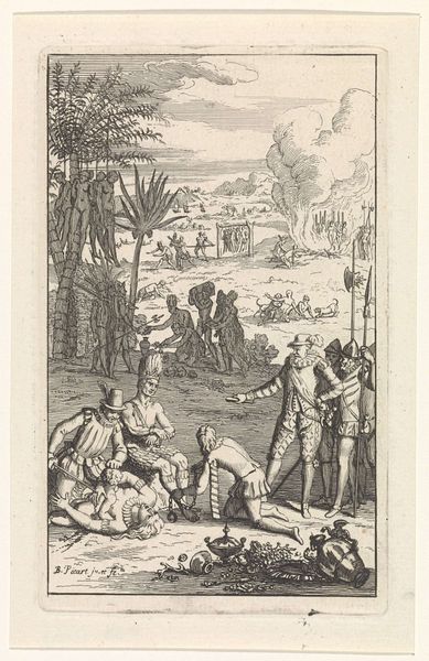 Curator: This engraving by Jan van Vianen, created in 1686, is entitled "Atalanta en Hippomenes" and resides at the Rijksmuseum. I find the composition intriguing. Editor: My initial impression is a strange mix of dynamic action and societal constraint; a group watches as this pursuit unfolds, overseen by an older, controlling figure. Curator: Precisely. Van Vianen masterfully uses line work to create a sense of depth. Notice how the lines become finer and more closely spaced in the background to simulate distance, almost creating a stage for the drama. Semiotically, the figures’ musculature embodies classic heroic forms, while the stylized trees seem to gesture and lean towards the runners. Editor: That heroic form stands in sharp contrast to Atalanta's forced competition, though. We know the story, Hippomenes defeats Atalanta in the race by using golden apples to distract her. This is a visual manifestation of a culture that prioritizes male achievement. Curator: The line engraving technique enhances the contrast of light and shadow, providing texture that alludes to movement. We see Atalanta’s gown flowing, frozen in the engraver's hand but very evocative of physical exertion. Consider the philosophical implications here, we are made to question ideas around surface, depth, perspective, and truth as the artist mediates mythology and its impact. Editor: That flow can also speak to a certain performativity surrounding women's roles at the time. We are invited, maybe forced, to witness her downfall. The active elements of the print emphasize power relations and socially prescribed performances of gender roles. Even more intriguing is that title: "Emblems d'Amour"—isn't there a paradox given the trickery involved in the couple coming together? Curator: That ambiguity, a tension in representation, serves to engage us. Van Vianen delivers narrative richness that draws us into the philosophical underpinnings, demanding reflection on not only technique, but the art of storytelling through spatial, chromatic, and haptic suggestion. Editor: Right, by connecting historical narrative to contemporary examination we uncover more layered dialogues. Curator: Exactly. The engraving's interplay of dynamism and stillness highlights not only technical adroitness, but philosophical questioning. Editor: And by interpreting the image through the lens of love, power and gender, we can begin a discussion that still echoes in contemporary discourses.