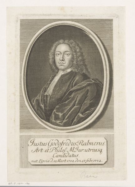 Curator: Before us is "Portret van Johann Jacob Zwierlein," an engraving created around 1735 by Johann Martin Bernigeroth. It's part of the Rijksmuseum's collection. Editor: My first impression is that the work exudes formal reserve. The engraved lines create such a rigid structure, like an official decree captured in monochrome. It makes me wonder about the symbols that lend dignity to his portrait. Curator: Yes, the composition is key here. Notice the careful arrangement of lines, the use of shadow to define form within the oval. It gives a powerful three-dimensionality using just a single plate. The base, the oval frame, and the lettering are very stable structural elements. Editor: Indeed, let's consider the symbols. The elaborate wig, for example, immediately signals status and learning, a marker of the baroque era’s fascination with both reason and elaborate displays of power. This connects him to legal circles, surely. Curator: Absolutely. It reinforces the intellectual tenor we should expect from a piece dedicated to such a figure. Even the texture achieved with the engraved lines is a signal, in itself, of skill, elevating the subject matter through pure craftsmanship. Editor: And what about the lettering beneath the portrait? In bold pronouncements, he's made to be the most Imperial of Advocates, which would seem to align with both personal ambition, as well as the hopes and needs of an expanding Empire. How might Bernigeroth choose to portray such an ideal of empire? Curator: By emphasizing precision. It's all in the rigorous control and distribution of tone through the lines; they describe everything perfectly, from Zwierlein's very sober face to the folds in his clothing, nothing is blurred. Editor: An astute reading! As a visual strategy, you suggest Bernigeroth has consciously elevated one element to meet another—a visual echo between the style of technique and his advocate's aspirations. How wonderfully baroque; what could seem arbitrary at first turns out to be part of the language that makes sense to the artwork overall. Curator: Precisely. When examining images from this period, looking closely at the lines, their qualities, helps us better understand not only the style of that moment but its intellectual aspirations, too. Editor: I’ll think about Zwierlein now as something of an eternal idea of justice from the era, set immaculately as only engraving knows how to fix a thing into permanent visual history.