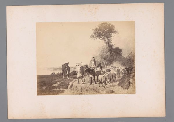 Curator: This is a photo reproduction of a painting by Jan de Haas titled "A Herd of Cows," predating 1863. Editor: It's serene, almost dreamlike. The soft focus lends it a pastoral tranquility, despite the presence of so many weighty bovine figures. Curator: Indeed. In looking at the reproduction itself as an object, and considering the period, we can unpack the emergence of photography as a technology democratizing art. Consider how reproductive technologies broadened access and reshaped artistic authority and the traditional hierarchies of value in art institutions. Editor: It does feel as if de Haas, or rather, Fierlants who made the photo reproduction, was consciously evoking the archetypal symbolism of the Golden Age. Think of the cow as a figure of plenty, prosperity, the embodiment of agrarian life. Their placid nature transmits a certain contentment, a communion with nature. Curator: And there is perhaps an undercurrent of class politics here as well, with this idealization of the rural, juxtaposed against growing industrialization of the time, where artists such as de Haas—through photography’s reproduction—can appeal to broader audiences, and make statements about the changing social landscape. Who has access to land, resources, beauty. Editor: That is so well observed! I would even venture into interpreting the light—the subdued palette. In its haziness I almost perceive a nostalgia—a yearning for a rural simplicity as the world hurtles towards modernity. It taps into a collective visual memory of what Europe was, or was perceived to be. Curator: So we begin to untangle threads of access, class, pastoral ideals, and memory interwoven within this singular photograph! Editor: Exactly. It leaves me pondering the nature of such enduring visual symbols, and our consistent human impulse to represent our relationship with nature. Curator: Precisely, this act of reproduction enables a democratization, albeit with the photograph still taken by someone like Fierlants of particular standing, with certain interests. Both access to technology, access to images is uneven. Editor: A nuanced vision, I agree. Well, that's certainly given me a lot to think about, especially the shifting currents of symbolism embedded here. Curator: Yes, the way art speaks across different axes of power, social status, and collective desire for an accessible art is worthy of ongoing inquiry.