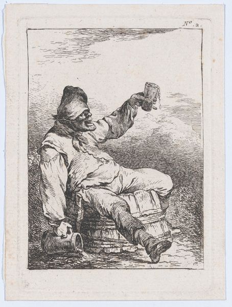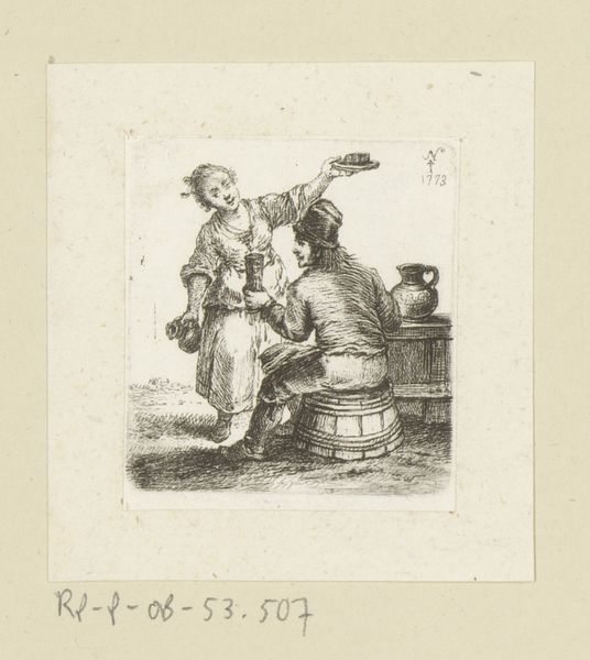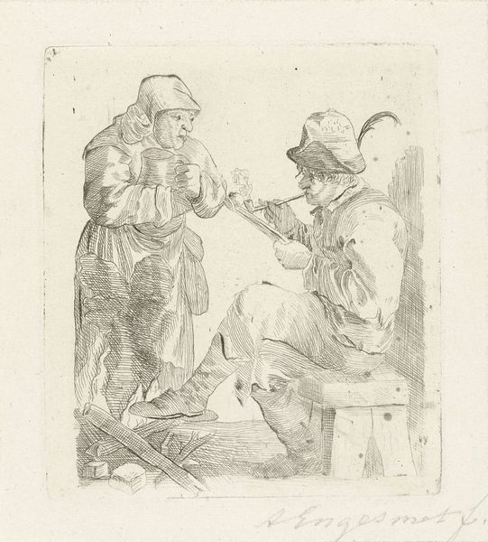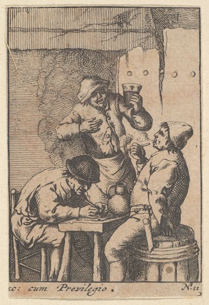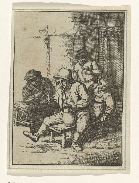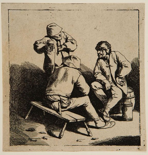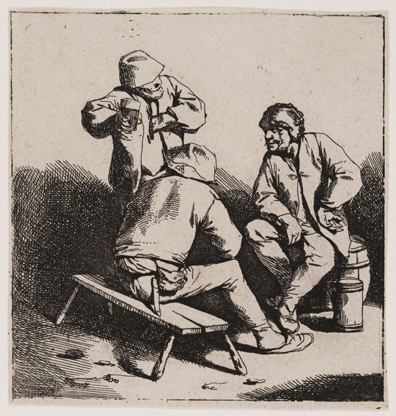 Curator: This is "The Three Drinkers" by Cornelis Bega, a 17th-century Dutch artist. Look closely at how Bega uses the etching technique to bring this intimate tavern scene to life. Editor: It's so earthy! I can almost smell the ale and hear their laughter. The composition seems to draw you right into their convivial circle, doesn’t it? Curator: Note Bega's meticulous use of line and shadow. The figures are rendered with precise detail, yet the overall effect is one of casual spontaneity. Consider how the arrangement of the figures creates a visual rhythm. Editor: True, true. It's also that slightly crooked bench and the spills on the ground! Bega captures real life, not some idealized version of it. Curator: Indeed. The careful orchestration of form and tone elevates what might seem like a mundane genre scene into a study of human nature. Editor: It's a reminder that art doesn't always need to be grand to be profound. There’s beauty in the everyday, right?
