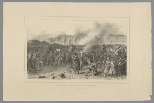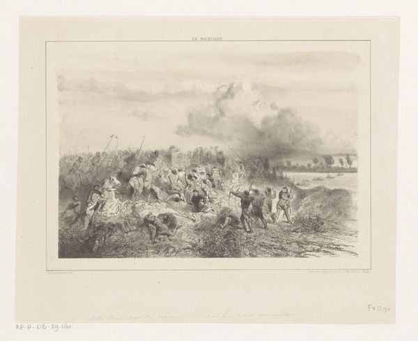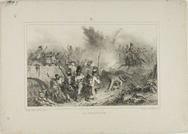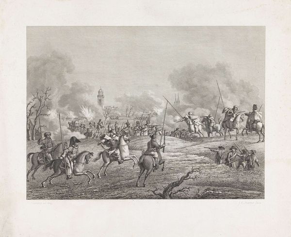 Curator: This lithograph by Auguste Raffet, titled "Provins 1814," was made in 1833 and depicts a tumultuous battle scene. What's your first impression? Editor: My immediate response is of chaotic energy. The swirling composition, densely packed with figures, immediately suggests movement and disruption. There's a real tension in the contrast between the dense foreground and the faded cityscape in the background. Curator: Indeed. Raffet, who often focused on military subjects, here captures the tail end of Napoleon's campaigns in France. Provins, the town depicted, witnessed intense fighting as the allied forces advanced on Paris. Editor: The dynamism is largely achieved, it seems to me, through the clever use of line. The lines are quite variable—dense, thin, short, long—which enhances the chaotic atmosphere. What is he communicating about these moments in history? Curator: Consider that battle scenes served not only as records but as potent cultural narratives, reinforcing ideas of patriotism and sacrifice. The drum in the lower left is more than an incidental detail. In wartime, a drum’s thundering roll serves as a literal and symbolic heartbeat to call soldiers to fight for their country. Raffet is, in effect, invoking those emotions through its imagery, speaking directly to viewers long after the historical events faded away. Editor: A cultural heartbeat rendered with some exceptional technique, I must add. The texture Raffet achieves through lithography—it's fascinating. See how the density of marks suggests depth and dimension, especially amidst the flurry of combat. Even with so few tones, a striking sense of light and shadow. Curator: Raffet masterfully conveys the scale of conflict. This single image echoes across time, evoking sentiments surrounding military actions in an age before photojournalism. The imagery of war continues to be potent in modern life. Editor: I agree, and observing the print closely allows an analysis of its formal strategies which effectively contribute to this lasting impact. Curator: Studying “Provins 1814” grants insight into the strategies and values that imbue even seemingly simple drawings and prints with significant historical, psychological, and social importance. Editor: For me, analyzing how those lines create space, depth, and movement lets me see just how impactful close formal analysis can be.