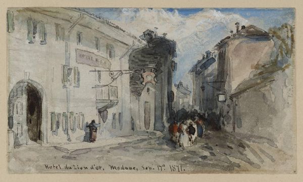 Editor: I’m immediately struck by the quiet stillness of this cityscape; it’s rendered with such subtle tonality. Curator: Indeed. What you’re observing is “Stadspleintje,” or "Small City Square," by Johannes Bosboom, made with watercolor, pencil, and charcoal between 1827 and 1891. It’s currently held at the Rijksmuseum. Editor: The figures, mostly women it seems, are placed quite deliberately, almost like actors on a stage. The nun at the forefront, especially, her dark garb a stark contrast against the muted palette… she holds a certain gravity. Curator: Notice how the geometric framework, that square structure at the center, punctuates the visual field. Bosboom’s expertise is apparent in his utilization of structuralist organization to communicate a sense of architectural solidity, even permanence. Editor: I find it fascinating that Bosboom chose such mundane scenery. City squares were commonplace. Why immortalize this in particular? It's also curious to note the well-like structure and the figures surrounding it: these evoke social communion and religious practice; like visual motifs encoding the social-spiritual importance of simple everyday scenes. Curator: Agreed. Furthermore, Bosboom seems very self-aware, considering how space interacts with light, almost to underscore the ephemeral quality of a romantic landscape piece such as this. One could make a very convincing case, if only the archival evidence supported it… Editor: Whether Bosboom planned this or not, "Stadspleintje" resonates today for me. The woman's religious symbolism gives meaning to what otherwise looks like another modest slice-of-life watercolor. Thank you for shedding light on that, Curator. Curator: My pleasure, Editor. It is in exploring form and image together that we start truly to appreciate art’s potential.