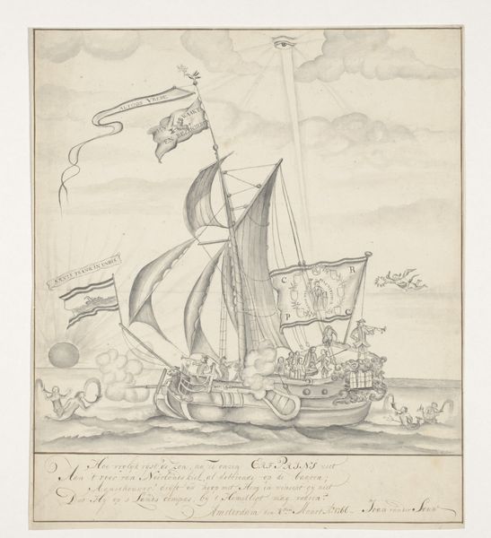 Editor: This is "Decoration at the house of Mr. J. van der Souw in Amsterdam, 1766", an engraving by Noach van der (II) Meer, dating from around 1774-1776. The ship under a divine, all-seeing eye, sailing towards the sun, gives a really strong impression. What social forces do you see at play here? Curator: The print clearly references the power and prestige associated with Dutch maritime trade. The prominent display of the ship suggests wealth, exploration, and the political power linked to naval strength. How does the artist depict this power, and for what audience? Editor: Well, the size of the ship and the presence of many people on board speaks to success, but the divine eye and angelic figures seem almost allegorical. Curator: Precisely! Think about the context of the Dutch Republic. It was a nation built on trade, and imagery like this print reinforced a sense of national identity. The sun could represent new beginnings, or the enlightenment, shining on a nation favored by God. Who, exactly, is favored by God in this context? Editor: I see. It almost feels like propaganda now. Did these kinds of prints actually sway public opinion, or were they more of a symbolic statement? Curator: That is a great question! Disseminating information and molding perceptions are central to visual culture. The print served not just as decor but also as a form of visual rhetoric. What kind of societal impact did imagery like this ultimately have? It prompted discussions on identity and authority. Editor: Wow, looking at it that way gives me so much more to think about than just aesthetic appeal. Thanks for the fresh perspective! Curator: It's fascinating to analyze how art becomes intertwined with politics and social values over time, isn't it? Now I want to study similar art prints of the same period.