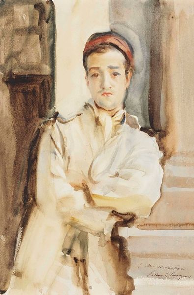 Curator: Zinaida Serebriakova painted "Portrait of V. M. Dukelsky" in 1920. Editor: There’s something haunting about the fluidity of this portrait. The subject's almost disappearing into the muted background. The textures are also interesting. Curator: Absolutely, the ethereal quality speaks volumes about the historical moment. The Russian Revolution had occurred just a few years before, and Serebriakova's work, while seemingly traditional in its portraiture, hints at the anxieties and uncertainties of that time. We need to consider her position as an artist who would soon emigrate from Russia, stripped of her property. This piece captures that state of transition, I feel. Editor: You can definitely sense the economic constraints pressing onto artistic output through the materials used. It looks like primarily watercolor on paper. This was possibly due to resource limitations imposed by war and revolution rather than artistic choices. Serebriakova and her family must have had to be increasingly resourceful in order to practice art as the revolution continued. Curator: The very act of creating art during such turmoil becomes a form of quiet resistance, wouldn't you say? While overtly political statements may not be present, her dedication to representing human form and emotion provides an invaluable counterpoint to the dehumanizing forces at play. The portrait aesthetic itself becomes charged. Editor: And notice the open shirt collar, the simplicity of the coat and the subtle gradations of tone; Serebriakova seems particularly concerned with natural light as she subtly models her subjects face and costume. A light coat of watercolour allows you to perceive a lot of the material qualities of the paper beneath. There’s a beauty in that apparent austerity. Curator: The soft rendering adds a layer of vulnerability to Dukelsky's expression. I perceive this man's eyes as embodying a kind of cautious hope. Is he weary from the era’s hardship or determined to build a new future? Perhaps the painting intentionally withholds answers. The focus on Dukelsky's personal gaze in a time of collectivization emphasizes the importance of individual stories and experiences amid larger social upheaval. Editor: Yes, that ambiguity makes it more profound to me. The subdued palette perhaps emphasizes the need to make do with limited available materials in a revolutionary, fractured landscape. Curator: Seeing the world through the lens of art from marginalized perspectives allows for more profound analysis. Thank you for highlighting materiality of artistic making here. Editor: And for illuminating the powerful social dimensions present even in apparently quiet artworks.
