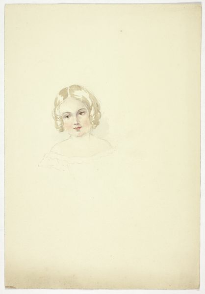 Editor: Here we have "Portrait of a Young Girl," a watercolor and graphite drawing created in 1849, and housed at the Art Institute of Chicago. The soft, delicate lines give it a somewhat dreamlike, idealized quality. How do you interpret this work? Curator: Notice how the artist utilizes both watercolor and graphite? That combination immediately creates a tension between ethereal washes of color and a structured, almost academic approach. This mirrors the complex cultural expectations placed upon young women during this period. The romantic era, while embracing emotion, also emphasized propriety. Editor: That's interesting. So you see her dress, maybe, as a symbol of societal expectation? Curator: Precisely. Pink, the color of her dress, walks a tightrope between innocence and burgeoning womanhood. The off-the-shoulder style hints at something beyond girlishness. Look, too, at the background; the blurred wash could symbolize a future still undefined, a world of possibilities and potential anxieties. Editor: It’s like she’s standing on the cusp of something. Curator: Yes! And the gaze, slightly averted, adds to the psychological weight. Is it coyness? Reservedness? The artist prompts us to question what is said, and what remains unspoken in portraying this moment of transition. Even her hair has these soft, innocent ringlets, framing a face that looks more self-aware. Editor: I hadn't really considered the mixed messages within this artwork before. Curator: Portraits always convey an intent. What stories do you think the family wanted to tell through it? What’s included, and what’s deliberately left out? These are the real questions a portrait like this provokes, reminding us of how images function as cultural echoes over time.