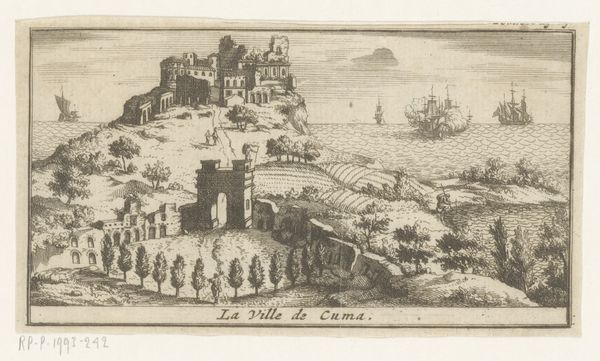 Editor: Here we have Pieter van der Aa’s print, "Gezicht op Miseno in de baai van Napels," created sometime between 1682 and 1730. It's a rather small landscape done in engraving and pen, depicting a coastal scene. I'm struck by how much detail he managed to capture, yet there’s a sort of wistful feeling to the scene. What's your take on it? Curator: Wistful is a great word! To me, it whispers tales of grand tours, when wealthy Europeans would travel, collecting impressions and, yes, views just like this one. This image almost feels like a memory fading at the edges, doesn't it? That finely wrought detail striving to capture a scene that time is already softening. Do you see how the artist focuses less on accuracy, and more on the romantic ruin? Editor: I do, now that you mention it. There’s almost a sense of fantasy even with the detailed lines. Were these prints intended more as souvenirs, then? Curator: Precisely! Imagine bringing this back home, a tangible fragment of a different world. It is a memento. They’re not just pretty pictures, they’re bottled experiences. The artist is less a recorder and more a storyteller. Do you agree? Editor: Absolutely! I initially saw a landscape, but it's so much more. I see it now as capturing an emotional moment in time as much as it is capturing a geographical place. Thank you. Curator: And thank you! I will carry a richer sense of emotional engagement, too!