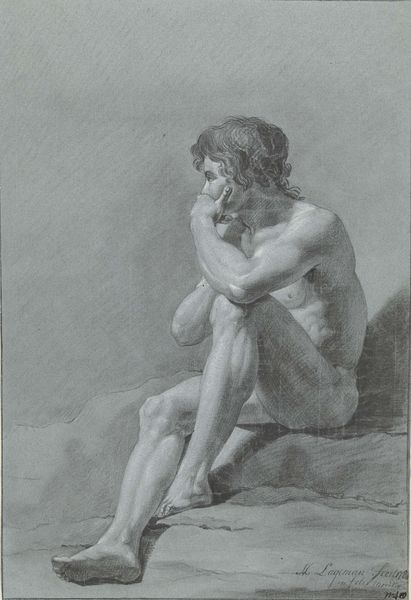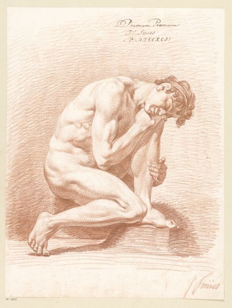 Jacob Willemz. de Vos created this sanguine drawing titled "Zittend mannelijk naakt, het hoofd op de knie" which translates to "Seated male nude, head on knee", but the date of its creation remains unknown. During the 18th and 19th centuries, the male nude served as both an academic exercise and an expression of idealized masculinity. This drawing can be situated in the larger history of representing the male form, often influenced by classical ideals of beauty. However, rather than an idealized figure, here we see vulnerability in this introspective pose. The positioning, with the head buried on the knees, communicates a sense of introspection or despair, hinting at the emotional complexities of masculinity beyond strength and stoicism. De Vos invites us to consider the relationship between the body and emotion, and challenges conventional heroic narratives. How might traditional representations of the male nude be complicated or subverted to express a wider spectrum of human experience?
