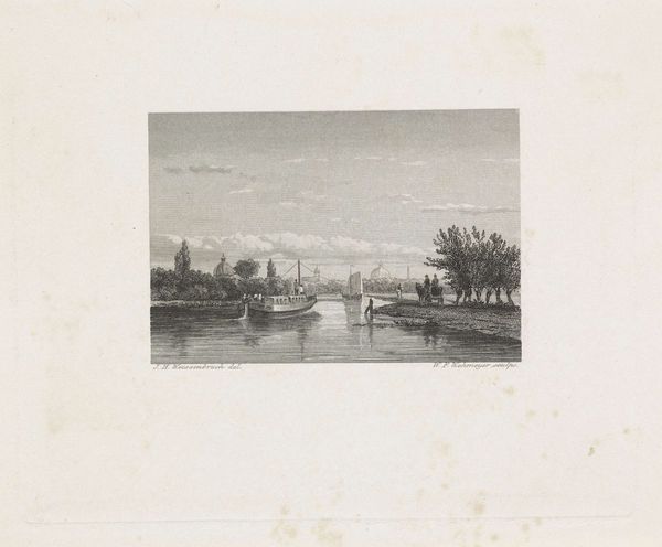 Curator: The artwork we're looking at is a print called "Zicht op de Seine vanaf de Pont Royal in Parijs," or "View of the Seine from the Pont Royal in Paris." It was created around 1838 by Louis-Julien Jacottet and is now held here at the Rijksmuseum. Editor: Immediately striking is the delicacy. It feels almost like a memory, faded and serene. The pale tones lend a wistful atmosphere. What I find fascinating, even in a piece depicting urban development, is the muted palette. Curator: The aged paper certainly contributes to that sense of history. But consider how the bridge, the Pont Royal, functions symbolically. Bridges often represent connection, transitions—perhaps even social change fermenting during this period of Parisian history? The July Revolution was only eight years prior. Editor: Absolutely. We have to read this piece through the lens of its socio-political moment. The industrial elements juxtaposed with the serene cityscape invites reflection. What kind of 'connection' are we really seeing here? It feels less like a bridge between people, and more between past traditions and looming modernisation, which might not be innocent at all. Curator: I think you make an important point about modernisation and its potential disruptions. There's something inherently nostalgic about the Romantic style that is exemplified here, an almost elegiac quality as if yearning for a perhaps simpler, bygone era, as change becomes unavoidable. Editor: Precisely, and those visual codes can tell us so much about anxieties around progress. The city, presented so gently, still conceals potential upheavals beneath its surface. By overlooking those shadows and that tension, aren’t we romanticizing and neutralizing forces that impact certain lives? Curator: I suppose, at its core, this piece underscores a continuous push and pull between our projected ideals, or yearnings, for continuity and connection against the undeniable forces of material change. And these visual artifacts provide, at the very least, insight to social anxieties that resonate still. Editor: It's in wrestling with these questions – seeing the art not just for its surface beauty but for its social implications – that it really comes alive. Thanks for untangling some of that with me.