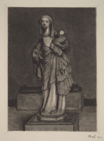Editor: This etching, "Landschap met vrouw," made sometime between 1841 and 1887 by Anna Cécile Nahuys, features a woman in a landscape. It has a kind of somber feel. I'm curious, looking at it from your perspective, what strikes you most about this print? Curator: Well, for me, it's the way Nahuys employs etching to create a layered sense of production, almost a tension between industrial reproduction and intimate craft. Note the depiction of the woman, seemingly weighed down by unseen forces, while cherubs loom overhead. Editor: Yes, she does seem burdened. What unseen forces are you referring to? Curator: Think about the process of etching itself, the labor involved in the acid, the lines etched on the plate, and then the pressing. The woman's apparent weariness is a visual manifestation of the larger forces at play – the physical demands inherent in both artmaking and the expectations placed on women in society. Those cherubs...are they heavenly figures or more symbolic of omnipresent judgement? Editor: That’s interesting; the repetitive nature of etching, reflecting potentially repetitive and tedious work, perhaps? What does that then tell us about who might have purchased a print like this at that time? Curator: Precisely! It prompts questions about the consumption of art, particularly landscapes, and their connection to labor. Was this print acquired to ennoble, perhaps obscure, a patron's exploitative economic practices by celebrating a constructed natural setting? Consider the societal context and economic underpinnings of its production and distribution. It also speaks to issues surrounding gendered labor in art and its impact. Editor: So, viewing it this way shifts it from just a pretty landscape to something with much deeper social commentary? Curator: Exactly! It transforms our understanding. It is no longer only about what the artwork depicts but about the social relations involved in its making and viewing. Editor: That gives me so much to think about regarding art’s relationship with labor and how to view art with these new lenses. Thanks so much!