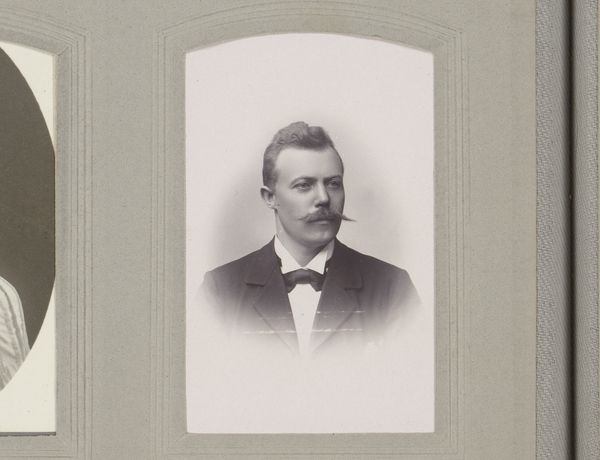 Editor: Here we have Édouard Fabronius's "Portret van een man met snor," a gelatin silver print, dating from 1891 to 1908. The man's gaze and serious expression create a formal tone, capturing a bygone era. What do you see in this piece? Curator: Immediately, the moustache strikes me, not just as facial hair, but as a statement. Think of the late 19th century: The moustache was a powerful emblem of masculinity, of course, but also of social standing, even political leanings. This particular style—the carefully groomed, handlebar moustache—what might it signify? Editor: Confidence? Worldliness? Curator: Precisely. The 'tache implies authority. Now, look at the slightly averted gaze. It's not defiance, but perhaps introspection, or a carefully controlled sense of observation. Could it suggest an awareness of being photographed, of crafting an image for posterity? This was long before our modern age of endless, informal photographs. Editor: So the very act of posing holds significance? Curator: Indeed. In those years, photography was a ritual, almost a performance. Clothes were selected meticulously; expressions carefully practiced. The goal was to project an ideal, not merely record a likeness. This is fascinating given his era – people would change and the moustache became symbolic to social status and manhood. I feel transported back in time just contemplating what this man believed the world to be! Editor: This has given me so much more to think about; I initially overlooked the significance of his moustache and expression, now, after your remarks, it makes this work even more special!