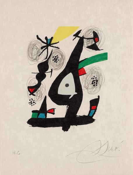Here we see "The Matador" by Joan Miró, a print that confronts us with a playful yet enigmatic composition. The stark contrast of black against the white paper creates a bold presence. Miró's use of primary colors—red, blue, and green—confined within the black outlines, offers a sense of contained energy, almost as if the forms are barely restrained. The thick, textured lines construct a figure that is both human and symbolic. Miró engages with semiotics through abstracted forms and colors, suggesting the matador without literal representation. This piece cleverly destabilizes fixed meanings by simplifying the visual language. Note the star and the floating shapes at the top, each element contributes to the overall sense of a dreamlike narrative. This composition reflects the artist's interest in challenging the traditional notions of representation, inviting a reinterpretation of familiar cultural symbols.