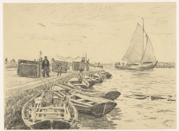 Curator: This is Johan Conrad Greive’s etching, “Gezicht op het Zuiderzee nabij Spakenburg,” dating roughly between 1847 and 1877. It now resides here at the Rijksmuseum. Editor: There's such a melancholy beauty to the greyscale tones; it's like peering into a memory, something almost forgotten but still lingering in the collective consciousness. The stillness in the water only adds to that, amplifying a profound sense of reflection. Curator: The image is deeply rooted in the Dutch Golden Age tradition, representing a specific place: the Zuiderzee near Spakenburg, which in the past, was the cultural and economical cornerstone of The Netherlands. Note how even the sailboats on the water have stories woven into their image. They act as a visual representation of connection and commerce, reminding viewers of the trade routes and exchanges. Editor: You're right, the sailboats almost act as leading lines, but the formal composition creates this incredible feeling of expansiveness using just monochrome shades. Notice, the horizon line almost bisects the print and draws the eye into the quiet sky. Curator: Skies in Dutch art of this period held particular importance, often being metaphors for fate and destiny. Clouds gathered symbolic value as well, often signifying impending doom or a change of fortune. But the presence of ordinary figures engaging with the boat suggests a hopeful narrative focused on resilience, tradition, and enduring community. The etching speaks of something permanent even as tides of change erode its shores. Editor: Yes, the symbolism lends a weighted quality to such humble material - but, looking at the formal characteristics of the print-making, the use of hatching to describe the water and texture on the boat and sand is extraordinary. I’m almost convinced I can feel the gritty dampness of that shoreline. The way he balances detail with atmospheric perspective—it's remarkably done. Curator: Indeed, there's a poignant interplay here, where the immediate tangible world meets a larger more intangible story of history, cultural memory, and maybe, the quiet hope for a horizon of one's own. Editor: Well, now I won’t be able to forget that the next time I stare out at the ocean, feeling contemplative or pensive. Thank you for your wonderful insight.