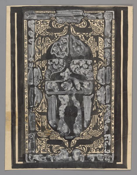 Carel Adolph Lion Cachet made this design for an ex libris, or bookplate, for D.J. Goedkoop, using brush and ink. The brushstrokes here feel so decisive, the kind of bold, graphic moves that come from knowing exactly what you want to say. It's like each mark is laid down with real intention, almost like a calligraphic gesture. Looking closely, you can see how the ink varies, creating depth and texture. The blacks are so rich and opaque in some areas, and then almost transparent in others, letting the paper breathe through. Notice the central shape, almost like a lamp, how the ink pools, and how the details are both precise and suggestive. The way Lion Cachet plays with positive and negative space makes this design so engaging. It's a dance of form and void, each informing the other. I see a connection with the work of someone like Hilma af Klint, with her interest in symbolism and abstract forms. Both artists are interested in the power of images to convey meaning beyond the purely representational.
