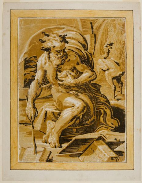 Editor: This is Ugo da Carpi's "Diogenes," created sometime between 1502 and 1532. It’s a charcoal drawing, and I find the monochrome palette quite striking, almost dreamlike. The figure seems caught in a moment of contemplation, but I am unsure what that entails. How do you interpret this work? Curator: Ah, yes, a Renaissance depiction of Diogenes. Carpi's captured a spirit more than a likeness, wouldn't you say? Diogenes was the ultimate contrarian, living in a tub, challenging societal norms with relentless honesty. The texture Carpi coaxes from the charcoal--it almost breathes, doesn't it? And the deliberate messiness...it mirrors Diogenes' rejection of order. Tell me, what details strike you first? Editor: I think the cooked chicken really stands out – it looks bizarre next to Diogenes! Also, the posture seems to exaggerate the subject's humanity, both his intellect and vulnerability. Curator: The plucked chicken! It is quite a humorous visual element, and, if I remember correctly, an unsubtle comment on Plato’s definition of man. Indeed! Look at the almost furrowed brow. To me, it speaks of both profound thought and…disappointment, perhaps? Does it evoke similar ideas for you? Editor: I never thought of that connection with Plato before! Maybe I am overly idealistic in my studies, but seeing this representation of a philosophical figure certainly broadens my perspective. Curator: Precisely. Art, you see, holds a mirror to the soul – a funhouse mirror sometimes, perhaps, but a reflection nonetheless. Art constantly invites me to reimagine. I wonder, is there a little Diogenes in us all? Editor: I think there is. Thanks, that’s given me a lot to think about!