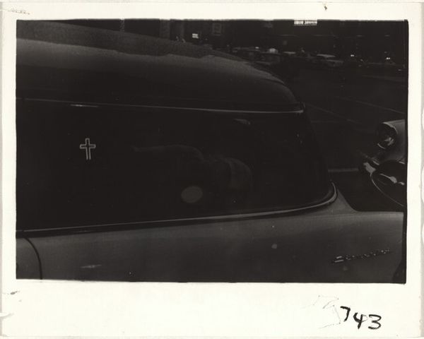 Curator: Here we have Robert Frank’s photograph, “Department store—Lincoln, Nebraska” from 1956. The image, rendered as a gelatin silver print, offers a glimpse into a moment of mid-century American commercialism. Editor: My initial sense is stark—almost clinical. The light is flat, and there's something profoundly sad about the mundane presentation of grief. White crosses, mass-produced, priced at just 69 cents. It's consumerism confronting mortality. Curator: Absolutely. Frank often focused his lens on the subtle dissonances within American society, and here he captures this almost transactional approach to remembrance. Consider the medium itself: the gelatin silver print, capable of rendering incredible detail, used here to depict… inexpensive memorials. Editor: It makes me think about labor, actually. The materials – the paper pulp, the chemicals, even the cardboard boxes – each a node in a vast, often unseen network of production and consumption. What kinds of jobs are represented here? How were these things made and distributed, and what did that mean for the people involved? Curator: And that sign – "Remember Your Loved Ones." It reduces genuine emotion to a purchase. Does it cheapen the act of remembrance, or make it more accessible to those of limited means? Frank leaves us to wrestle with that tension, doesn't he? The composition, with the neat stacks and the generic typeface, reinforces this sense of detached commerciality. Editor: It's the context that unsettles me. The post-war boom years. Abundance and optimism… paired with these rows of potential memorials. A sort of pre-packaged grief. Even the blue annotation at the top right, some kind of store code or tally, brings the banality into even sharper relief. Curator: The choice of black and white is interesting too, right? It’s a practical choice for the time, of course, but it further distances us, intensifying the somber atmosphere, creating a visual metaphor for loss and absence. It allows us to observe these "loved ones" from a perspective that would never happen without such a clear medium choice, to analyze every texture and emotion in complete isolation. Editor: I agree. It’s a layered photograph, far beyond a simple snapshot of a department store display. A commentary on American values, perhaps even on our complicated relationship with death itself, all filtered through Frank’s unique and slightly detached gaze. A gaze both poignant and unsettlingly commercial. Curator: Indeed. It reminds us that art can reveal uncomfortable truths hiding in plain sight, compelling us to confront the ordinary, in a new light. Editor: Leaving us questioning the very structures that frame our daily rituals. Food for thought for sure, if perhaps bitter.