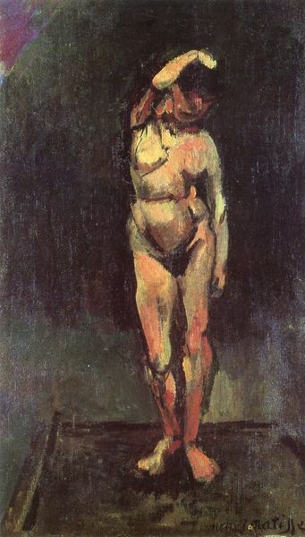 Curator: Welcome. We're looking at "Bed on the Loft," a nude by Anders Zorn. The medium appears to be oil on canvas, and its style suggests an interesting blend of realism and impressionism. What’s your immediate reaction? Editor: Stark, yet intimate. The limited palette throws the figure into high relief. It’s less sensual and more…observational. The rough brushstrokes against the dark background create this feeling of immediacy. Curator: Absolutely. When we consider the female gaze during Zorn’s time, there's a particular context regarding the body, often portrayed through the eyes of men and molded by social expectations. Editor: Yes, but how does the semiotics here challenge that, though? Look at her gaze—direct, almost confrontational. And the brushstrokes on her body celebrate her figure as an individual instead of a symbol or an object, embracing the surface. Curator: Indeed, her gaze confronts those historical representations. However, Zorn was a product of his time. How do we balance celebrating his rendering while challenging the ingrained sexism prevalent at the time? Editor: We must engage in critical viewing. Appreciate Zorn’s deft control of light and form to represent an honest figure, yet also discuss what biases, conscious or unconscious, may influence it. Curator: I agree. We’re pushing toward intersectional considerations. It acknowledges how diverse parts of a person’s social and political identities can come together, in this case challenging gender, and female portraiture. Editor: Her face radiates that same raw and pure expression. Its strength resides in its ability to be raw while embracing this artistic form. Curator: Ultimately, the work invites critical discussion. By balancing aesthetic appreciation with socio-historical context, we can unravel complexities of beauty and identity. Editor: I find myself newly appreciative of how Zorn used the surface to express form while at the same time, I understand it needs more scrutiny in consideration of female figure representation.