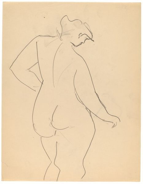 Curator: Before us is "Frontal Nude, Right Leg Slightly Raised, Hands Behind," a pencil drawing attributed to Mark Rothko. What strikes you first about this sketch? Editor: The vulnerability. It feels very raw, immediate, like a fleeting impression quickly captured. The figure is stark against the emptiness of the page, giving a sense of isolation. Curator: The use of line certainly emphasizes immediacy. Rothko's application, while simple, suggests much about form. The subtle hatching defines the contours. Are there qualities that indicate it as something other than just a figure study? Editor: Well, consider that Rothko later moved entirely to abstraction, purging figures from his work. To see him grappling here with representation is fascinating from an art-historical perspective. It speaks to the pressures of figurative art in early twentieth-century America versus his own exploration of pure color and form in his mature period. Curator: I see that, particularly when we view it alongside his explorations of myth and the subconscious. This early work reveals a foundation built on careful study, and the figure is almost architectural. Her stance—one leg slightly raised, weight shifted—is constructed with a precise intention of shifting the viewer's understanding. Editor: Right. I'd argue the subject's pose communicates uncertainty, or perhaps self-consciousness. Rothko's engagement with psychoanalysis makes one wonder if the blank space and the pose indicates internal conflict within the artist or in his broader public environment? Curator: A convincing idea when understanding its social implications, and maybe here, we find early echoes of Rothko's larger concerns with human drama, later played out on immense canvases of color. We are left not with a celebration of the body but perhaps the exploration of how that body comes to be as form. Editor: Indeed, contemplating the space between realism and abstraction here provides some valuable context to fully reflect on the Rothko we know from his iconic color field paintings. Thanks for your consideration of these possibilities.