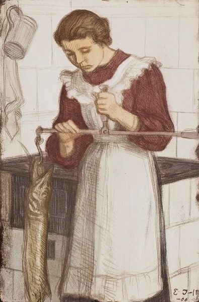 Curator: Here we see "Sitting Peasant Woman Holding A Cup In Her Hand," a watercolor work crafted in 1909 by Albert Anker. Editor: The somber mood of the composition strikes me first. The earthy colors and the subject's gentle gaze suggest a moment of quiet contemplation. Curator: Precisely. Anker's paintings often depict intimate scenes of everyday life, elevating the peasant class. This piece can be viewed as part of the broader realism movement of the time, focusing on representing subjects without idealization. Note the meticulous representation of the rural objects. Editor: Absolutely. Look at the intricate details in her traditional headdress and the patterns on the cup. The texture of the fabric, and the way the light catches the silverware adds an incredible sense of realism. This emphasis on the mundane transforms the painting into something exceptional, almost reverent. Curator: I agree. What's crucial is that Anker was attempting to establish the significance of genre paintings. At a time when history paintings and portraits of the wealthy dominated, the artwork offered a glimpse into the cultural norms of the time, inviting a direct engagement with those values through art. The act of sitting, holding the cup, all transform into a study of personhood through the artist’s keen perception of life. Editor: Thinking about it now, that is a wonderful point. He takes an ordinary scene and turns it into an occasion of significance, celebrating the virtue in the subject’s day to day. Curator: It prompts us to consider whose stories get told and remembered through art. Anker clearly sought to depict and appreciate the dignity of ordinary Swiss life in an era defined by rapid modernization. Editor: Ultimately, it's Anker’s skillful brush that provides an enduring moment. He masterfully balances realism with a sensitivity that resonates even today. Curator: Agreed. The painting certainly compels us to rethink the idea of mundane daily life and the possibility of its value, when represented in painting.