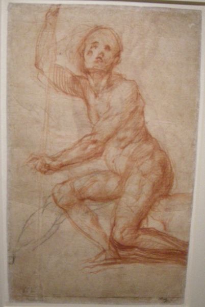 This drawing was made by Jacopo Pontormo, who lived in Florence during the high Renaissance. It's rendered with red chalk – a material made from iron oxide, mined and processed to create a soft, earthy drawing implement. The character of red chalk defines the image. It allows for both precision and soft, atmospheric effects. Look closely, and you can see how Pontormo built up the figure with layers of hatching, creating a sense of volume and musculature. This technique speaks to a tradition of careful craftsmanship and the study of human anatomy. Drawings like this were not considered finished works in themselves, but rather preparatory studies for paintings or sculptures. They show the artist grappling with form and composition. The multiple figures and gestural lines testify to a process of exploration and refinement. Considering the material and the drawing technique helps us to appreciate the skill, labor, and artistry involved in creating this work. It challenges the idea of art as purely intellectual, emphasizing the importance of the artist's hand and the materiality of the medium.