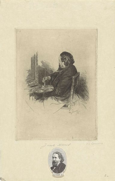 This is "Zittende grijsaard met wandelstok in zijn handen" by Pierre Louis Dubourcq, an etching showing a seated old man with a walking stick. During the 19th century, there was an increased focus on the individual, influenced by Romanticism and later Realism. This work delves into the experience of aging, reflecting broader societal attitudes toward the elderly and the value placed on their wisdom and life experience. Look at the man's stooped posture. It conveys a sense of weariness and introspection. His coarse coat suggests a life of hardship. The walking stick, more than just a support, becomes a symbol of his journey through life, marked by the passage of time. This image resonates with anyone who has witnessed aging, in themselves or others. It invites us to reflect on our own attitudes toward aging and how we value the experiences of those who have lived long lives. This poignant portrayal prompts consideration of the societal structures that either support or marginalize the elderly.