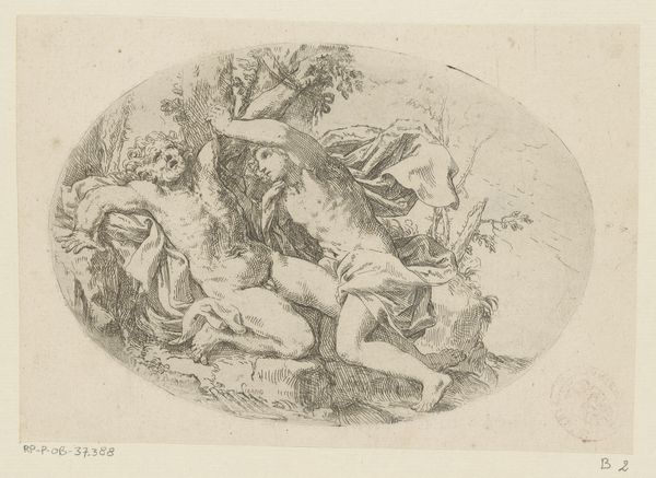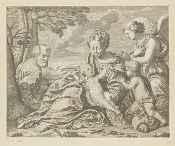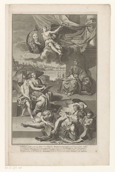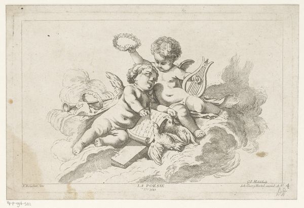 Editor: Here we have C.O. Gelirnard’s 1752 engraving, "Allegorische voorstelling met figuren op een wolk," or Allegorical Representation with Figures on a Cloud. It's a flurry of figures and decorative elements! What stylistic features jump out at you? Curator: The prominence of line and form dictates the visual experience. Observe how Gelirnard manipulates line weight to establish depth and shadow, particularly in the drapery of the figures. The curves and counter-curves lend dynamism, a hallmark of the Baroque style. Editor: The figures really do seem to float! What’s the impact of the composition, specifically, on how we read the figures' relationships to each other? Curator: The asymmetrical balance generates visual interest while emphasizing the central escutcheon, which seems to serve as a visual and symbolic anchor. Notice the varied positioning of the figures around the cloud. Their gestures create implied lines of connection and direct the viewer's gaze throughout the composition. The texture is compelling too. The artist rendered such varied surfaces simply by deploying very thin and precise line work, and controlling how densely he wanted to pack them. Editor: It’s clever how the arrangement guides the eye! Did Baroque engravings often include so much ornamentation, or is it to serve another goal? Curator: Ornamentation is fundamental. Consider the floral garland surrounding the escutcheon, mirroring the crown atop it, all within this complex visual interplay. These details function to elevate the allegorical meaning, as well as emphasize both aristocratic and theological symbolism common to the period. Note how the artist deployed very controlled burin marks to achieve this result. It suggests very sophisticated artistic capabilities, even at the cost of being somewhat overwrought for contemporary tastes. Editor: It does feel rich. So the artist uses both composition and technique to reinforce meaning here. It makes you realize just how much intention can go into what seems decorative! Curator: Precisely! The emphasis isn't solely on historical accuracy or narrative but on the aesthetic and intellectual experience delivered by formal structure and the materiality of line.