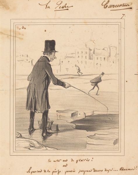 Curator: This is Honoré Daumier's lithograph, "Here is a pleasant surprise!", showing a figure ice fishing. Editor: It’s bleak! The sketchy lines and monochromatic palette evoke a real sense of isolation, even with other figures in the background. Curator: Daumier, known for his political and social commentary, uses the act of ice fishing to critique the bourgeoisie’s relentless pursuit of leisure, even to absurd extremes. Editor: Look at the way the ice is rendered, almost like fractured glass. The printmaking process itself, with its reliance on stone and acid, mirrors the harshness of the scene. Curator: Precisely. The print becomes a means to question the very foundations upon which societal values are built, especially class and power dynamics. Editor: The materiality of lithography allowed for mass production, making Daumier's critique accessible to a wide audience, and influencing the consumption of satirical imagery. Curator: A point well taken. Daumier's piece challenges us to see the satirical in the everyday, recognizing how systems of power are reproduced through cultural practices. Editor: I see the icy landscape as a metaphor for the cold, indifferent nature of social stratification within the elite. It’s a stark reminder that some pursuits are inherently isolating.