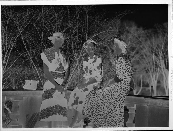 Editor: Here we have an intriguing photograph, "Untitled (three women sitting on balustrade)" by Lucian and Mary Brown. It's a small, snapshot-sized print that evokes a sense of mystery with its stark contrast. What jumps out at you when you look at this? Curator: Well, for starters, it feels like peering into a memory, doesn't it? The inverted tones give it this otherworldly quality, like a dream fading at the edges. I'm immediately drawn to the women's dresses; they’re almost dissolving into the background, yet their patterns hint at a vibrant life. I can almost smell the sunshine and feel the balustrade beneath their hands. Does it invite you into their conversation, or does it keep you at bay? Editor: I feel a little like an eavesdropper, but definitely intrigued! I hadn’t considered the dresses in that way before. Curator: Yes, me too. The fact that it's a shared work makes me wonder, did one click the shutter, or was it a collaborative dance? So many unanswered questions! Editor: That’s a great point! This perspective is really fascinating.