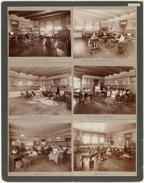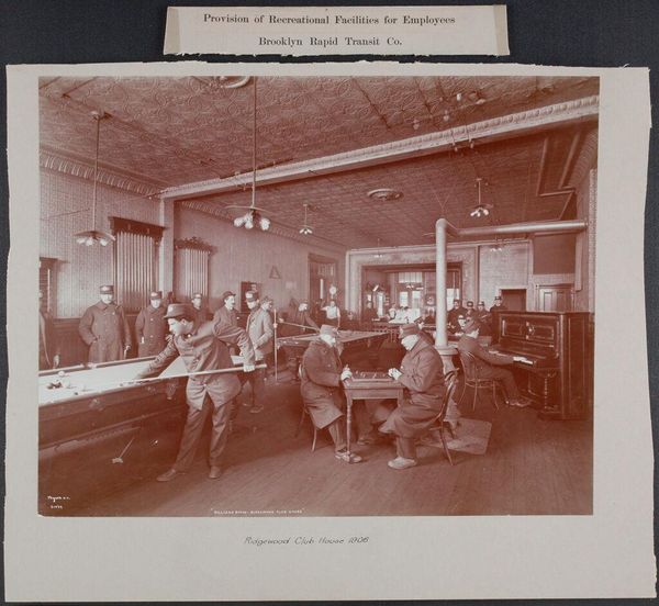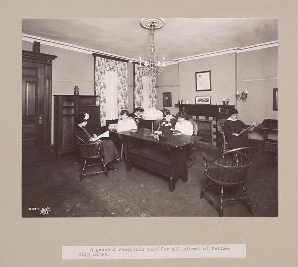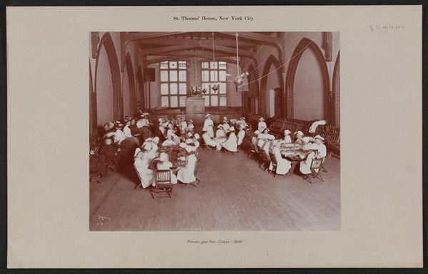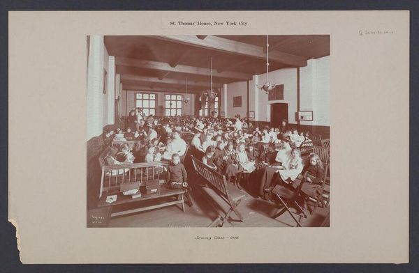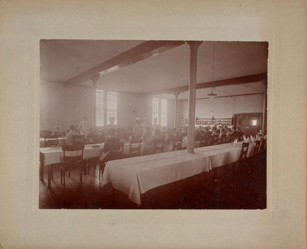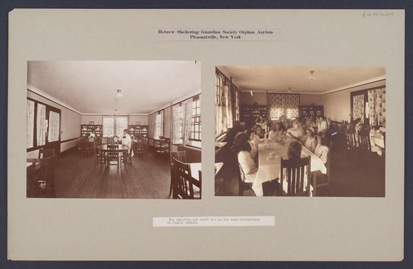 Curator: This photographic print by the Geo R. Lawrence Co. captures scenes from the South Parks in Chicago. Titled "Social Settlements: United States. Illinois. Chicago. 'South Parks'," it offers a glimpse into early community spaces. Editor: It strikes me as austere, almost melancholic. The sepia tones and formal compositions suggest a world striving for order. Curator: It is interesting to think about these social settlements as spaces of negotiation. Who was welcome? Who was excluded? And how did class and race dynamics play out within these designed environments? Editor: Absolutely. And notice the emphasis on material culture. The solid tables, the rows upon rows of books, even the garments. They all speak to a certain kind of social ambition, a desire for uplift through access to resources and goods. Curator: A fascinating snapshot of early social reform efforts, reminding us of the complex relationship between space, class, and social mobility. Editor: Indeed, a window into the past, revealing enduring questions about equity and access.