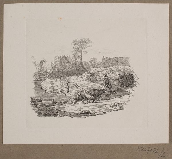 Curator: Before us, we have Niels Skovgaard's "Kvarnen," an etching from 1903, held here at the SMK. A seemingly tranquil, almost bucolic scene. Editor: My immediate response is…serenity. There's a palpable quietness emanating from this piece. The composition, while detailed, has a soothing, almost dreamlike quality. What do you see as the prominent features? Curator: Structurally, the eye is led from the detailed foreground—with its figures and chickens—back to the more loosely rendered background dominated by the trees and mill structures. Note the masterful use of line to delineate form and texture. The building itself is reminiscent of older Nordic architectural styles. Editor: It is interesting that Skovgaard, known for his romantic nationalism, depicts an agricultural site, calling attention to the labor central to both national identity and social structures. Consider the working class here as fundamental not only to the artist’s era, but also for the endurance of tradition during industrial transformation. Curator: Certainly, and one could also analyze the balance—the placement of the thatched roofed structure on the left against the larger copse of trees to the right. It's a composition rooted in harmony. Editor: But what harmony are we talking about, really? There's labour happening there, perhaps exploitative? How are gender and social hierarchies performed in an apparently picturesque scene, one which arguably downplays its complicated politics and inequalities? Are chickens the only labourers recognized? Curator: I concede your point that it’s overly picturesque, to an extent ignoring some realities. Still, as an etching, it reveals Skovgaard's control of the medium, a meticulous and complex artistic structure. Editor: And while technically impressive, the artwork offers a significant historical insight if viewed within broader dialogues about land ownership, resource allocation, and societal exploitation, especially through its intentional and perhaps sanitized rendering of this Nordic landscape. Curator: It certainly challenges any simple reading. Well, a provocative lens to examine what at first glance appeared simply pastoral! Editor: Yes! A potent reminder to continually challenge our preconceived ideas.