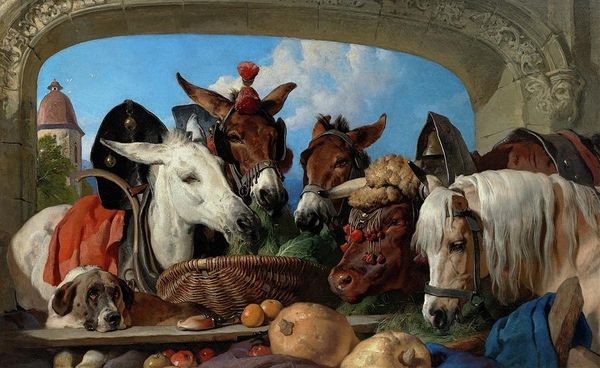 Curator: At first glance, this painting evokes a real sense of the indignity suffered in this image of two figures stuck in this rural village contraption, the stocks, against the background of the village common. Editor: I am immediately struck by the textures. Pettie uses oil paint, and look at how the coarse, roughly hewn wood of the stocks contrasts with the fine cloth of the figures' garments, not to mention the rough canvas or whatever fabric the saddle is made of—clearly visible, each holding its unique impression! Curator: Indeed. This is John Pettie's "Hudibras and Ralpho in the Stocks," painted in 1867, drawing from Samuel Butler's satirical poem "Hudibras," a critique of the English Puritan movement during the Restoration period. Editor: Pettie’s choice to highlight that material dichotomy speaks volumes, doesn't it? You have the supposed "purity" and "simplicity" of these figures juxtaposed with the very raw, and likely uncomfortable, constraints imposed by society on them through something literally as rudimentary as rough hewn wood. Think about the work involved to just cut those posts and shape the head and foot boards, and how basic this is to delivering some sort of crude village justice. Curator: Precisely. The stocks become a powerful symbol of the repression and public shaming inflicted upon those deemed non-conformist. Look closely: one man almost seems in tears while the other contemplates quietly. It serves as a timeless reminder of the human cost of ideological conflict. We understand so much by their emotional gestures what we see in the way the bodies react to constraint and pressure! Editor: It's also fascinating how Pettie uses the setting. The rural environment, the scattered refuse at the base of the stocks—old hats and uprooted roots, perhaps to throw?—highlights the unglamorous reality of everyday life. There's nothing "high art" about any of this and more accurately depicts just a very routine occurrence. Curator: Yes, the seeming casualness underscores that the spectacle has become normalized, even mundane, revealing the dangers of accepted persecution and intolerance over time. Editor: Ultimately, Pettie's technique blends classical romanticism with realistic portrayals, inviting viewers to consider both the broad social implications and very individual pain. Curator: A rich tapestry of symbol, emotion, and critique. A truly evocative piece of art. Editor: Indeed. A powerful statement wrought from wood, paint and very critical intentions.