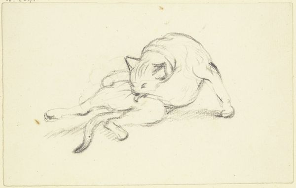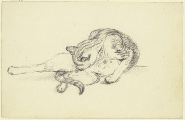 Friedrich Wilhelm Hirt captured this feline moment in a delicate pencil sketch. The drawing presents a cat in the midst of grooming, a common, intimate act now immortalized on paper. Made by a German artist, the image enters into a lineage of animal studies, a genre that gained prominence in the context of expanding natural science in the 18th and 19th centuries. Artists like Hirt turned to animal subjects to reflect a broader cultural interest in the natural world, one that was increasingly mediated through the lenses of scientific inquiry. While the drawing may seem straightforward, it reflects the social conditions that shaped artistic production. Historical sources can help us understand the meanings and cultural values that were assigned to animals in earlier times. This drawing reminds us that art is never created in a vacuum, and that its interpretation requires an understanding of its historical and institutional context.