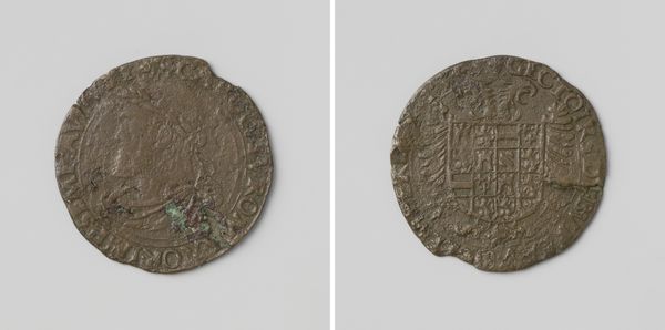 Editor: Here we have a fascinating metal carving from 1539: a 'rekenpenning,' or counting penny, of Karel V, the Holy Roman Emperor. It’s quite worn, and gives me such a tangible feeling of the past! What strikes you most when you look at this, thinking about what this penny might signify? Curator: Oh, the stories it could tell! It makes me think about power, doesn't it? This little metal disc was a tool of the financial council, essentially a calculator. So cold and metallic, yet it represents the very blood that flowed through the empire's veins, extracted by Charles' men! Can you imagine him knowing his face would literally grease the wheels of commerce? A chillingly funny thought, don’t you think? Editor: That's a darkly poetic perspective! I hadn't considered the almost satirical angle of his portrait facilitating royal finance. Were these coins like miniature propaganda pieces? Curator: In a way, absolutely! Currency always projects an image of power. I wonder, gazing at the wear, if this particular coin witnessed heated arguments, sat through long nights of calculating… What a busy little witness! It really humanizes those far-off bureaucratic processes for me, bringing history right into the palm of your hand. Editor: It definitely does. It's incredible to think of all the unseen hands that touched this coin over centuries, working and scheming. Thanks, this gave me a richer perspective to appreciate. Curator: My pleasure. A little worn coin can truly awaken a world of grand meaning!