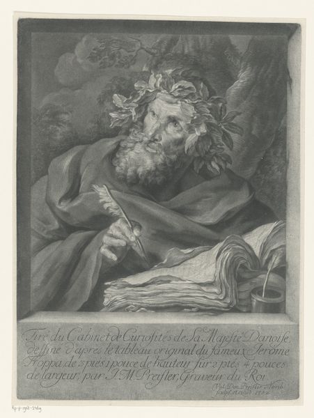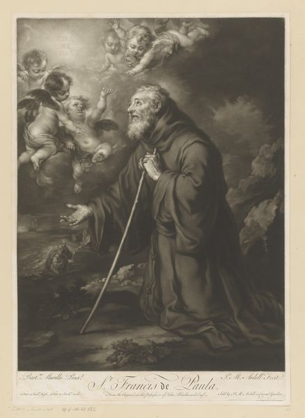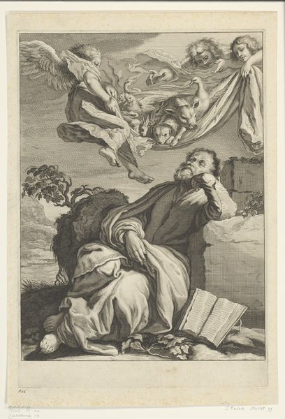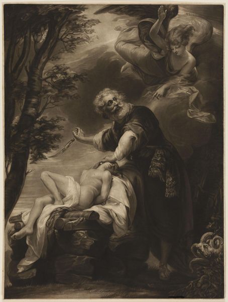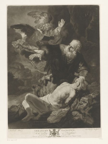 Editor: Here we have Johann Gottfried Haid's 1767 engraving, "The Sacrifice of Isaac," held at the Rijksmuseum. The shading gives the scene a dramatic feel, and the composition is strikingly triangular. What catches your eye about this work? Curator: Formally, it's intriguing. Note how the artist uses light and shadow to create depth and tension. Observe the lines, the way they direct the gaze. The angel's arm is an element of tonal and linear disruption. Consider how the engraver’s marks contribute to the overall impact, not merely as representational devices. Editor: The angel does stand out with its lighter tone compared to the darker Abraham. Is that intentional? Curator: Undeniably. The contrast serves to emphasize the divine intervention and draws attention to the angel’s gesture, disrupting what might have been Abraham's linear trajectory. We see, through light and the lines defining form, the drama heightened. Note the averted eyes of the recumbent Isaac and Abraham looking at the divine messenger. A clear interplay is at work. Editor: So the piece isn't just telling a story; it's about the artist's deliberate choices in shaping the image? Curator: Precisely. The subject serves the structure. It is Haid’s control over tonal value and composition, not merely the depiction of a biblical story, that lends the print its unique power and elevates it beyond simple illustration. Editor: That changes my perspective on the engraving completely! Now, I see beyond the narrative to how it’s been visually constructed. Curator: Indeed. To recognize and appreciate that it is how elements combine is what this exercise invites in viewing artworks such as "The Sacrifice of Isaac".