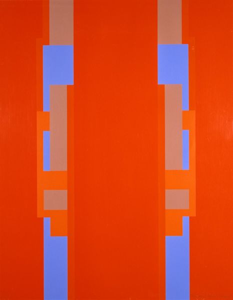 Ronnie Landfield’s "Red Painting For Romania" is a structured composition in which geometric forms are carefully arranged. Predominantly red, the painting is framed by a vivid yellow border. This color combination evokes a sense of warmth, perhaps even urgency. Across the canvas, horizontal lines of white and blue dissect the red field, creating a layered effect. Two black squares sit near the bottom, divided by a vertical orange form, adding depth to the otherwise flat plane. The composition has a structuralist approach, emphasizing the relationships between these basic shapes and colors rather than representing any external reality. The painting’s title suggests a connection to Romania. The use of specific colors and their arrangement may allude to the country's flag or cultural identity. This prompts us to consider how visual elements can function as signs, encoding meaning that is both personal to the artist and open to broader cultural interpretation. As you continue to explore this artwork, contemplate how Landfield uses color and geometric forms to create a space that is not merely decorative but a site of cultural and perhaps political reflection.
