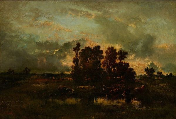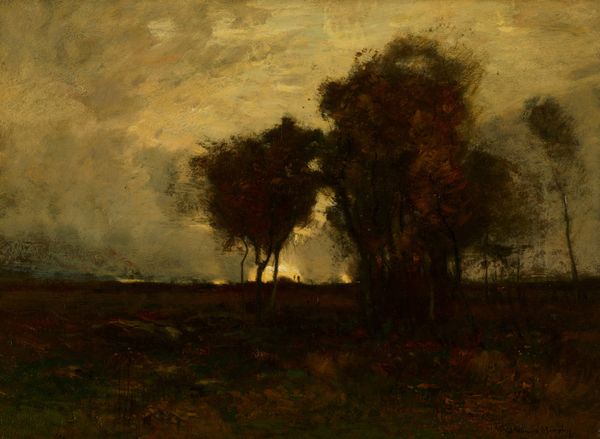 Robert Julian Onderdonk painted this evocative "Landscape" with oil on canvas. The trees, rendered in shadowy greens and browns under a dusky sky, carry echoes of the ancient grove, a motif rich in cultural memory. Consider the sacred groves of antiquity, places of ritual and sanctuary. The trees here, though not overtly religious, evoke a similar sense of quietude and introspection. One could argue that they are a secular echo of such spiritual spaces. The way the light filters through the trees, reminiscent of divine illumination, also echoes the same, recurring yearning for connection with the sublime. This landscape, therefore, isn't merely a scene, but a vessel carrying centuries of emotional and symbolic weight. This echoes the cycles of nature, from life to death, symbolizing continuous renewal and resurrection, themes which resurface through human history and culture.