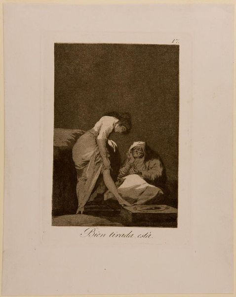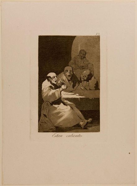 Curator: This etching by Francisco Goya, titled "Here Comes the Bogie-Man," presents an unsettling scene. What's your initial impression? Editor: Stark. The high contrast between the shadowy figure and the terrified family creates a mood of intense dread. Compositionally, the bogeyman dominates the scene. Curator: Goya was deeply critical of the social and political landscape of his time. "El Coco" was a cautionary figure used to frighten children into obedience. Editor: The aquatint technique gives depth to the shadows, really emphasizing the figure's ominous presence. The distortion of form is also key here. Curator: Absolutely. Goya uses this imagery to comment on the use of fear as a tool for social control. The church and state used similar methods. Editor: And the figures' gestures! The mother shielding her children, their wide eyes... it’s a masterclass in portraying raw emotion. Curator: Indeed, it's a powerful indictment of societal manipulation. Editor: The formal elements and the subject matter merge to convey a feeling of helplessness. Curator: A fitting end to Goya's potent social critique. Editor: Art as a mirror reflecting the dark corners of our world.