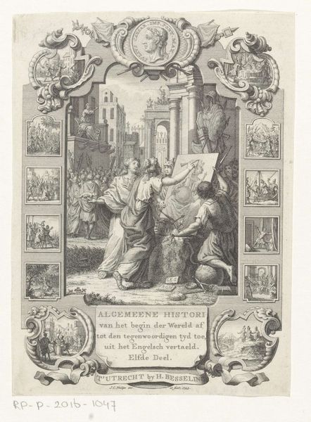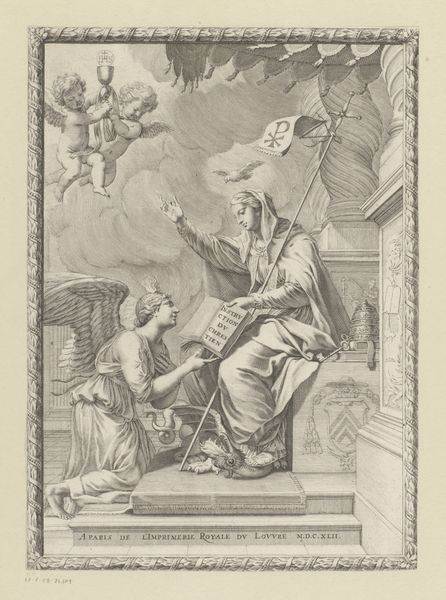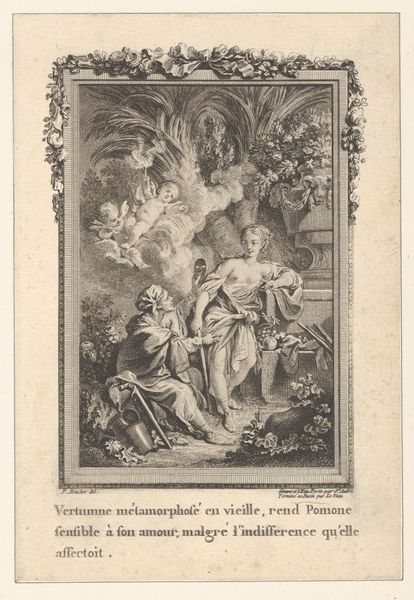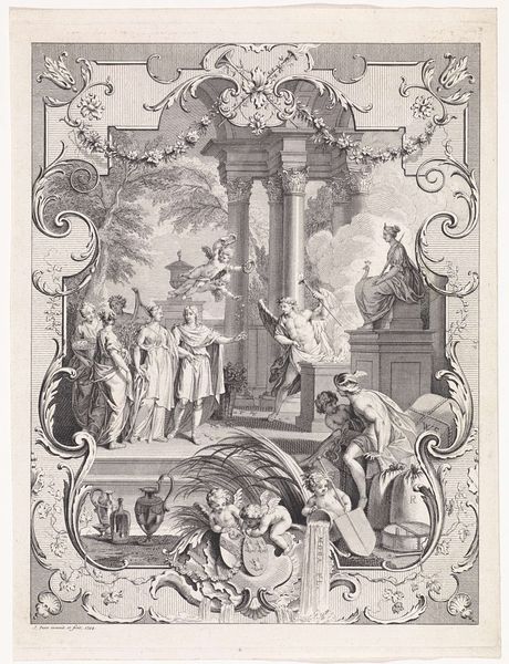 This engraving by Noël Le Mire depicts Melpomene crowning Mademoiselle La Clairon. Melpomene, the Greek muse of tragedy, crowns the actress Clairon, a celebrated figure of the 18th-century French stage. The laurel wreath, an ancient symbol of triumph and immortality, signifies Clairon's artistic achievements. We see this motif repeated in other artworks through time, such as renaissance paintings where victorious generals are crowned. It represents the cyclical return to classical ideals and the perpetual quest for recognition and remembrance. The crowning gesture here also speaks of a powerful, almost subconscious desire for honor and distinction. It taps into our collective memory of heroes and gods. This symbolic act ensures that the emotional intensity of the stage will live on, transcending generations.