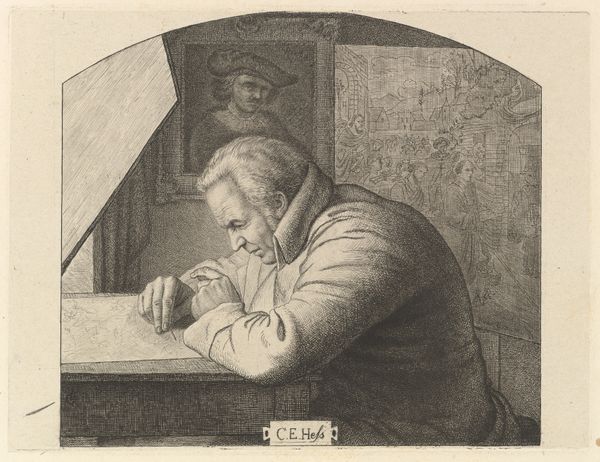 David van der Kellen created this etching of a reading monk in the Netherlands sometime in the mid-19th century. The image invites us to consider the place of religious study within Dutch society. The monk, identifiable by his tonsure and habit, sits absorbed in a large book, a skull and quill on the desk beside him. The skull is a memento mori, a reminder of death's inevitability, and the fleeting nature of earthly life. It’s a common trope in art history, particularly during the 16th and 17th centuries, though its revival here suggests a continued fascination with mortality, or perhaps a revival of older artistic traditions. Consider the social and political position of the Catholic church in the 19th-century Netherlands. The Dutch constitution of 1848 granted religious freedom, ending centuries of discrimination against Catholics. This etching may reflect a renewed interest in Catholicism, and in the contemplative life, within Dutch society. By consulting historical archives, religious studies, and art historical literature, we can better understand the complex interplay of religion, politics, and artistic expression in the Netherlands.