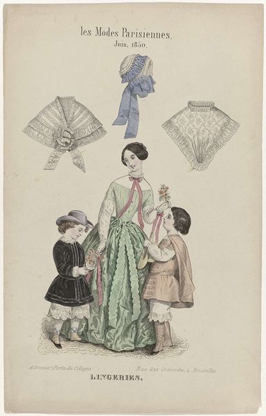 This is a print titled "Journal des Dames et des Modes, Frankfurt 1833, Costumes Parisiens (32)" by Friedrich Ludwig Neubauer. It presents a variety of women's fashion from the era. The composition is structured around the figures, each meticulously detailed to showcase the latest trends. The palette employs soft pastels, with blues, pinks, and greens dominating the garments. Each costume in this print serves as a signifier, encoding social and cultural meanings related to gender, class, and identity. Neubauer's work captures the semiotic complexity of fashion. It transforms clothing into a language capable of expressing nuances of status and aspiration. The print isn't merely a record of styles, it is an interpretation of the period's values. Consider the delicate linework and intricate patterns, how they emphasize the artifice and constructedness of these images. These elements invite us to decode the broader cultural codes embedded within the artwork's visual presentation. In its intricate design, the print reflects the values and social structures of its time, inviting continuous interpretation.